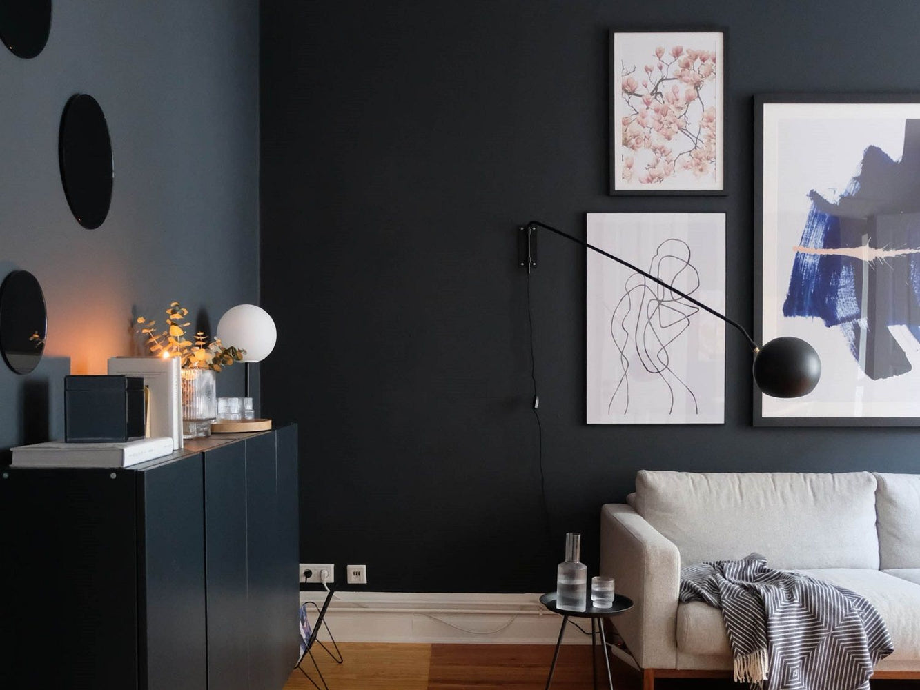 Zu dem ausdrucksstarken Dunkelblau kombiniert Sarah viel Weiß an den übrigen Wänden. Die großen, hellen Bilder an einer Wand durchbrechen optisch die dunkle Wandfarbe und lenken den Blick auf die gemütliche Sofaecke. Der dunkle Holzboden sorgt dazu für noch mehr Wärme und Gemütlichkeit.