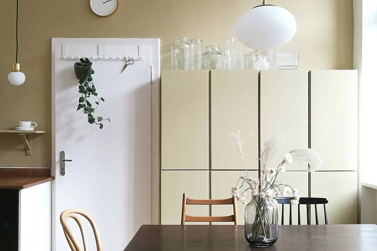 Kasia hat ihren IVAR mit dem seidenmatten Lack in einem Dunkelgrau-Ton lackiert und ihn zusätzlich mit farblich passenden Türknöpfen ausgestattet. Das Dunkelgrau hebt sich vor der weißen Wand schön kontrastreich ab und das Möbelstück wird so zu einem echten Hingucker im Esszimmer. Platz für Teller, Gläser und sonstiges Tischzubehör.