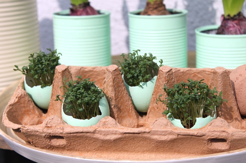 Pflanze nun die Kresse als fertiges Gewächs ein. Hübsch verpackt in einem Eierkarton kannst du sie geschützt transportieren oder gleich als Deko auf den Tisch stellen.