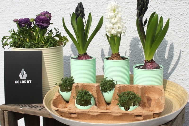 Ist's lackiert, spazier zum Gärtner um die Ecke und suche dir ein paar hübsche Frühlingsblumen oder auch Gartenkräuter aus. Sobald die Farbe getrocknet ist, kannst du die Pflanzen setzen.