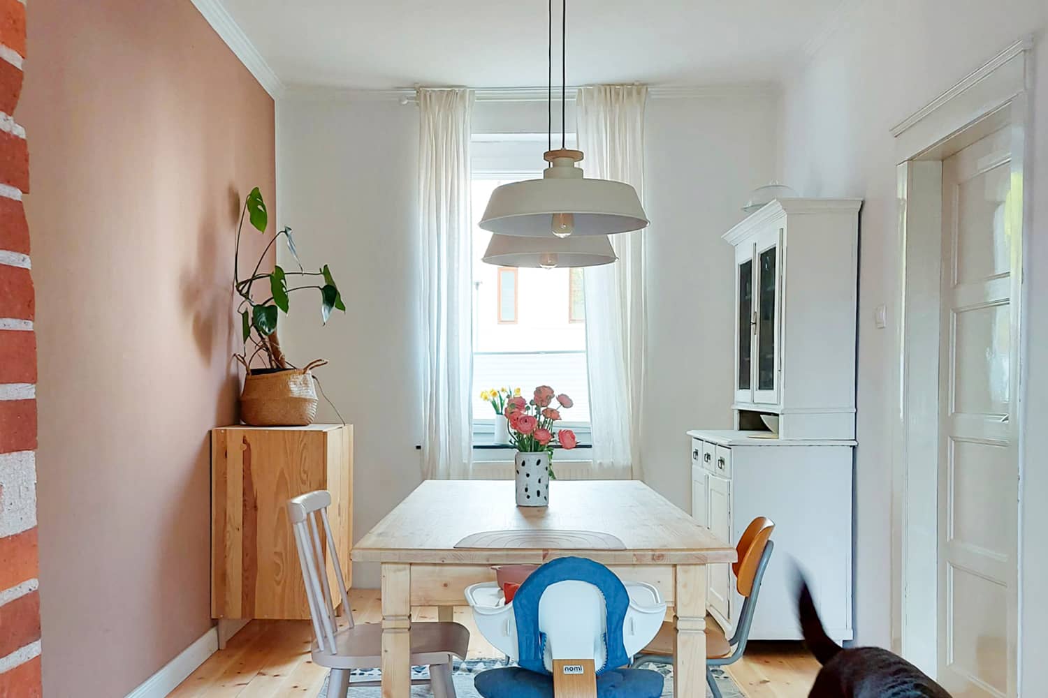 Anne hat sich in ihrem Esszimmer für eine Akzentwand in einem dunklen Rose in Richtung Apricot entschieden. Diese strahlt eine besondere Freude und Zärtlichkeit aus und verwandelt den Essbereich in einen Wohlfühlort. Die Wandfarbe passt zudem gut zu der angrenzenden Backsteinwand im Wohnbereich.