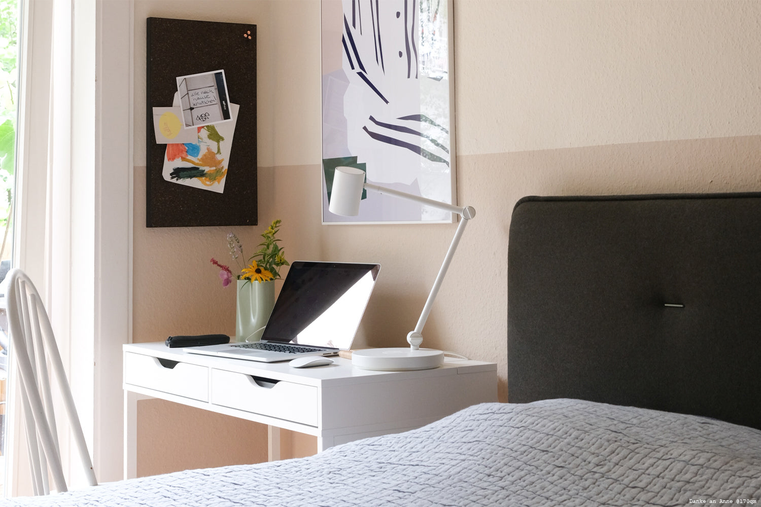 Mal anders als die Wände einfarbig streichen – Anne zeigt dir, wie es geht: Sie hat ihre Wände im Schlafzimmer halb-halb gestrichenen und kombiniert dafür zwei verschiedene Beige-Töne aus derselben Farbfamilie. Gewählt hat sie diese beiden sanften Erdtöne als matte Wandfarbe in Hochdeckend: