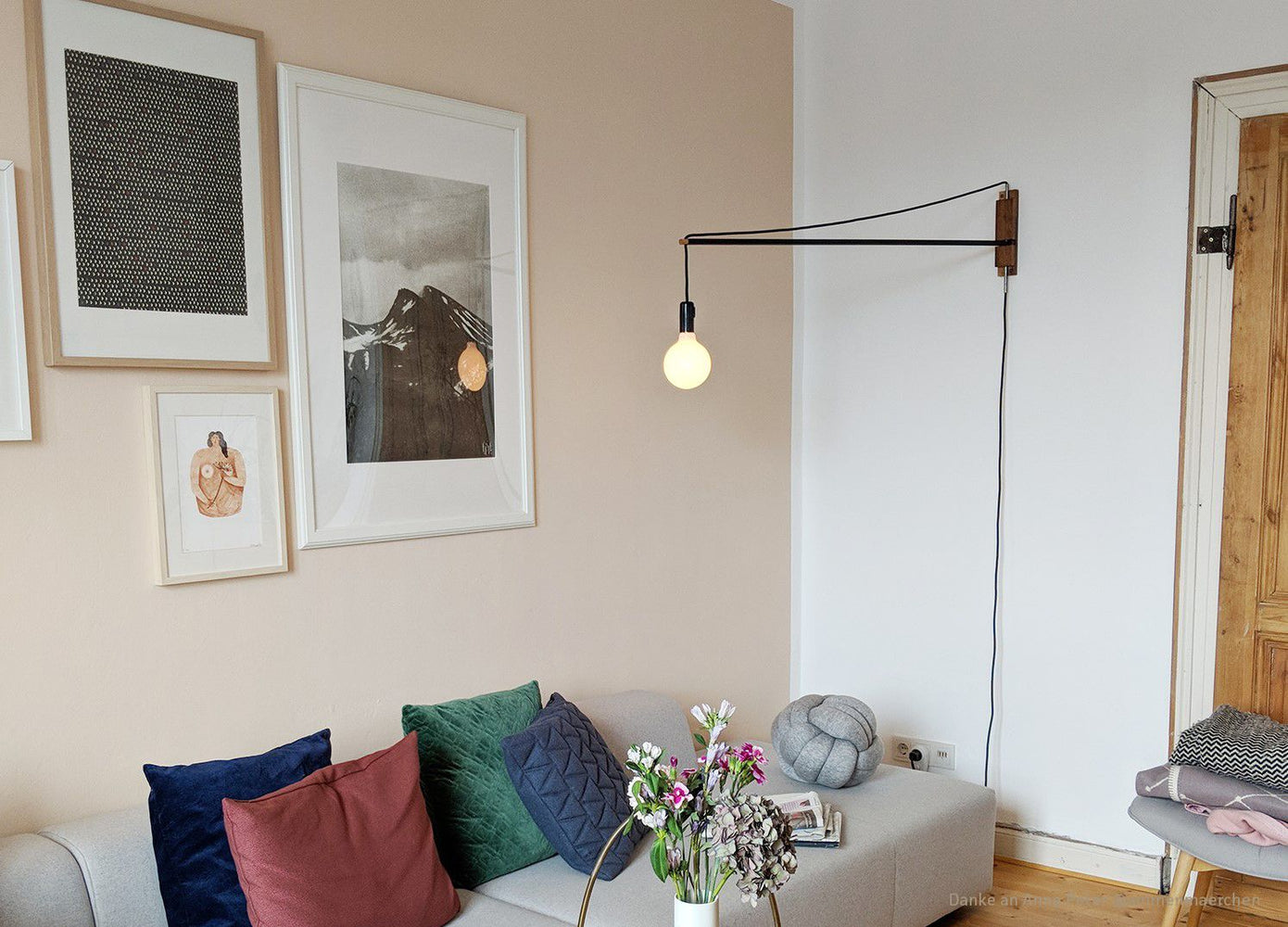 Wandfarben in Nude und Holz sind einfach ein traumhaftes Paar. Die graue Couch kombiniert zu der pastelligen Wandfarbe ist das I-Tüpfelchen. Alle Wandfarben hat Anne als Bio-Silikat-Variante gewählt. Diese Farben hat sie im Wohnzimmer gestrichen.