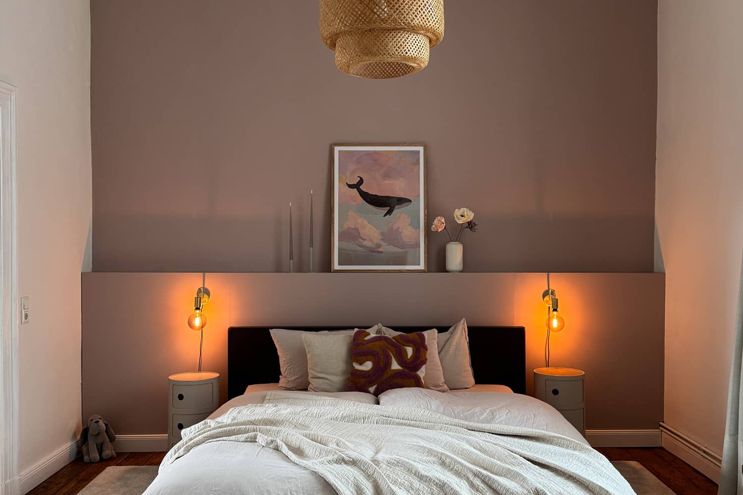 Davia hat sich für eine Akzentwand hinter dem Bett entschieden. Der Ton steht im Mittelpunkt und unterstreicht die ruhige Atmosphäre im Raum. Die restlichen Wände sind hell gestrichen und lassen das Altrosa noch feiner wirken.