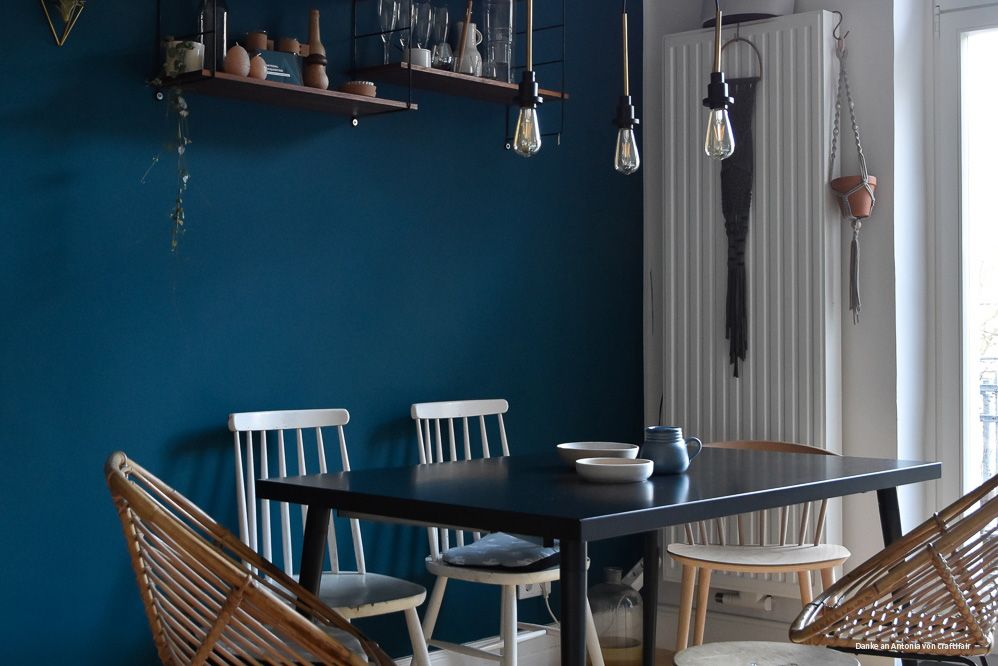 Die Möbel aus Holz sowie die Rattanstühle sind eine tolle Kombination zu der dunklen Wand. Mit den Pflanzen und kleinen Accssoires wird Antonias Esszimmer stilvoll abgerundet. Wenn du auch Lust auf petrolblaue Wände hast, entdecke hier die Farpalette von Petrol als Wandfarbe: