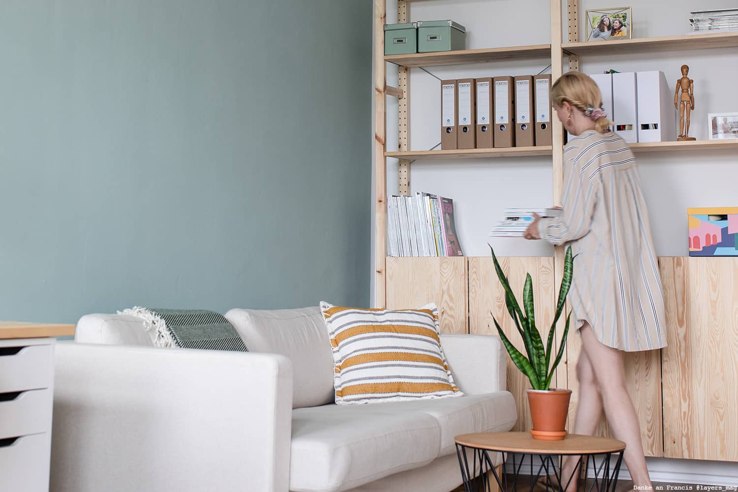 Francis hat ihr Arbeitszimmer gestrichen und für ihren Anstrich einen feinen Salbei-Ton mit Grauanteil gewählt. Gestrichen hat sie diesen Farbton in der Farbart Hochdeckend an einer Akzentwand im Raum, dazu kombiniert sie ein helles Weiß an der Decke und den anderen Wänden.