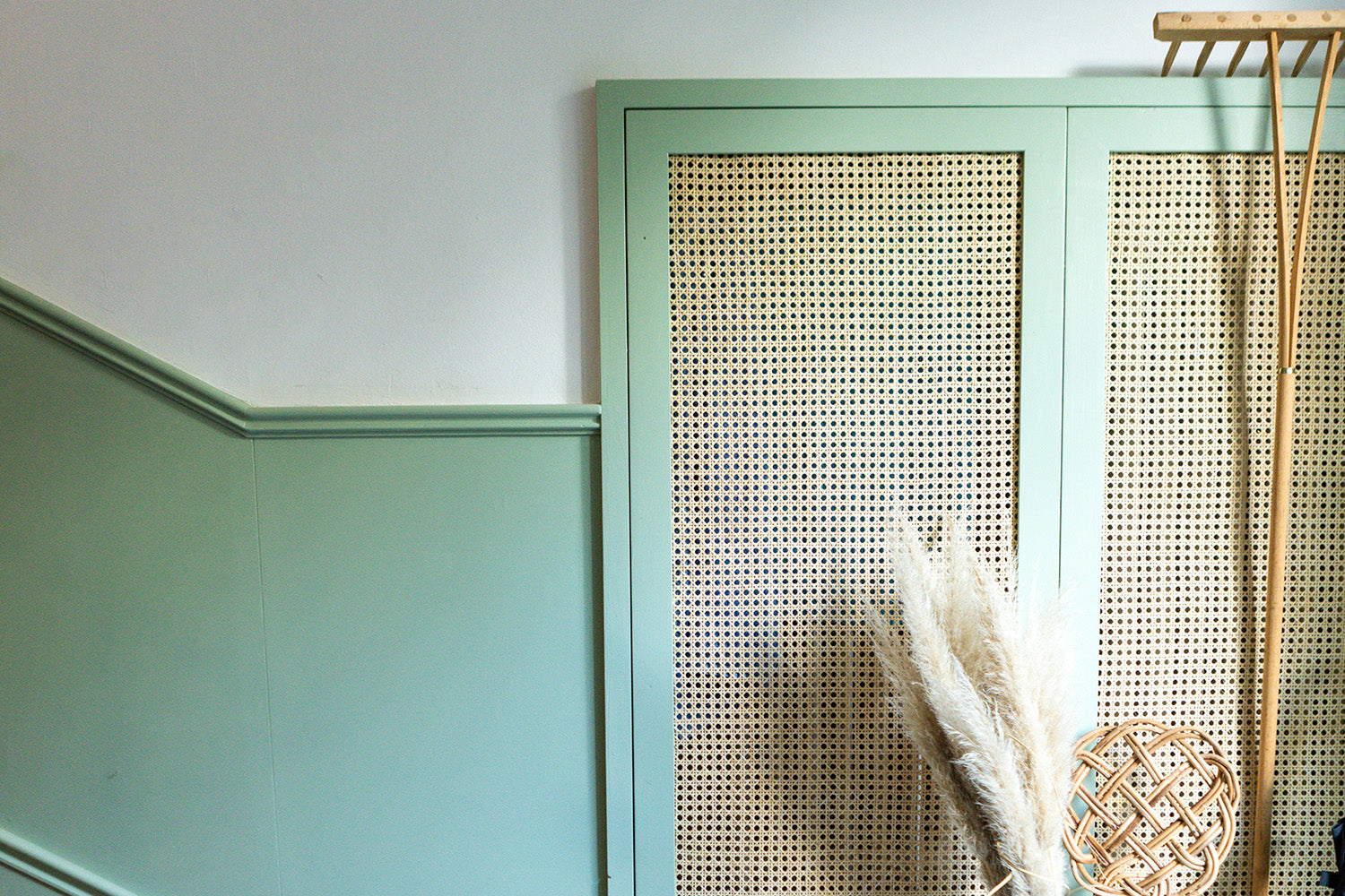 Franzi und Marius haben ihre selbstgebaute Wandvertäfelung im Flur in einem Grünton gestrichen. In Kombination mit neutralen Tönen wie Weiß oder Schwarz wird der Fokus auf die Wandvertäfelung gelenkt und bringt zudem weiche Übergänge und eine gemütliche Atmosphäre in den Eingangsbereich. Die vorhandene Türe zum Keller haben sie im gleichen Farbton lackiert.