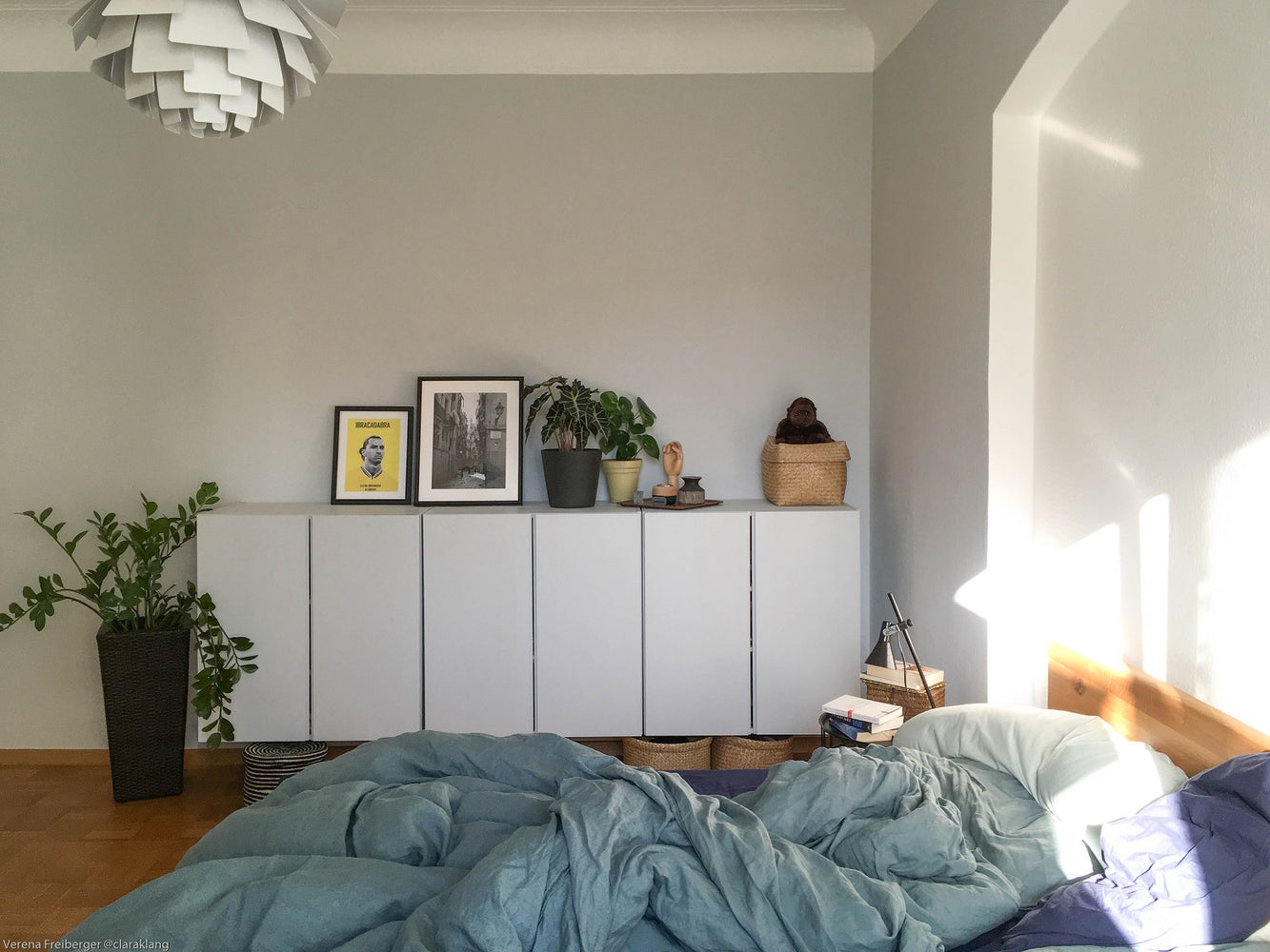 Hell und einladend wirkt die Kombination aus hellgrauer Wandfarbe und Ton-in-Ton lackiertem IVAR Schrank. Gestrichen hat Verena bei beiden diesen Farbton in Hellgrau.