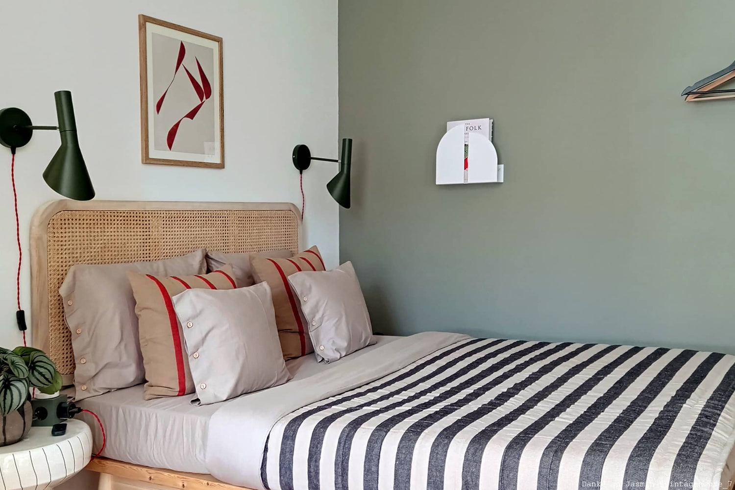 Jasmin hat sich für ein sanftes Graugrün entschieden – ein Farbton, der Ruhe und Harmonie ins Schlafzimmer bringt. Durch die Kombination mit hellen Möbeln und natürlichen Materialien entsteht ein klarer, reduzierter Look.