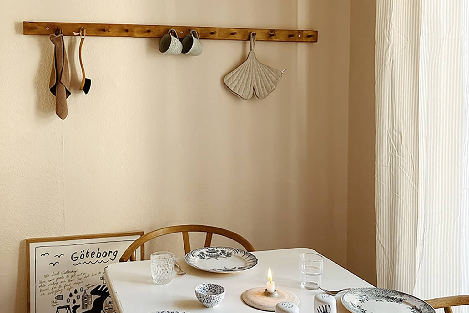 Diese Farbnuance kombiniert mit hellem Interieur bringt Leichtigkeit und Gemütlichkeit in Josies Esszimmer. Der warme Beigeton unterstreicht den skandinavischen Einrichtungsstil und harmoniert zudem wunderbar mit Holz – wie hier bei Josie der Boden oder die Stühle.