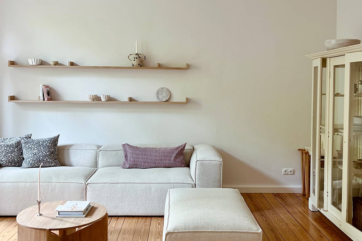 Der helle Greige-Ton der Wände harmoniert mit den Holzdielen und den erhaltenen Stuckelementen. Altbau-Charme trifft moderne Farbgestaltung. Josies Wohnzimmer wirkt offen, stilvoll und dabei wohlig.
