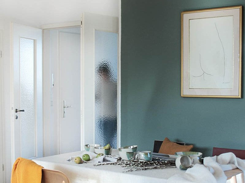 Eine Akzentwand hat Judith in einem feinen Dunkelgrün gestrichen. Die Farbe hat sie in der Farbart Hochdeckend mit der ganz matten Oberfläche gewählt. Dies ist Judiths Farbton in Dunkelgrün.