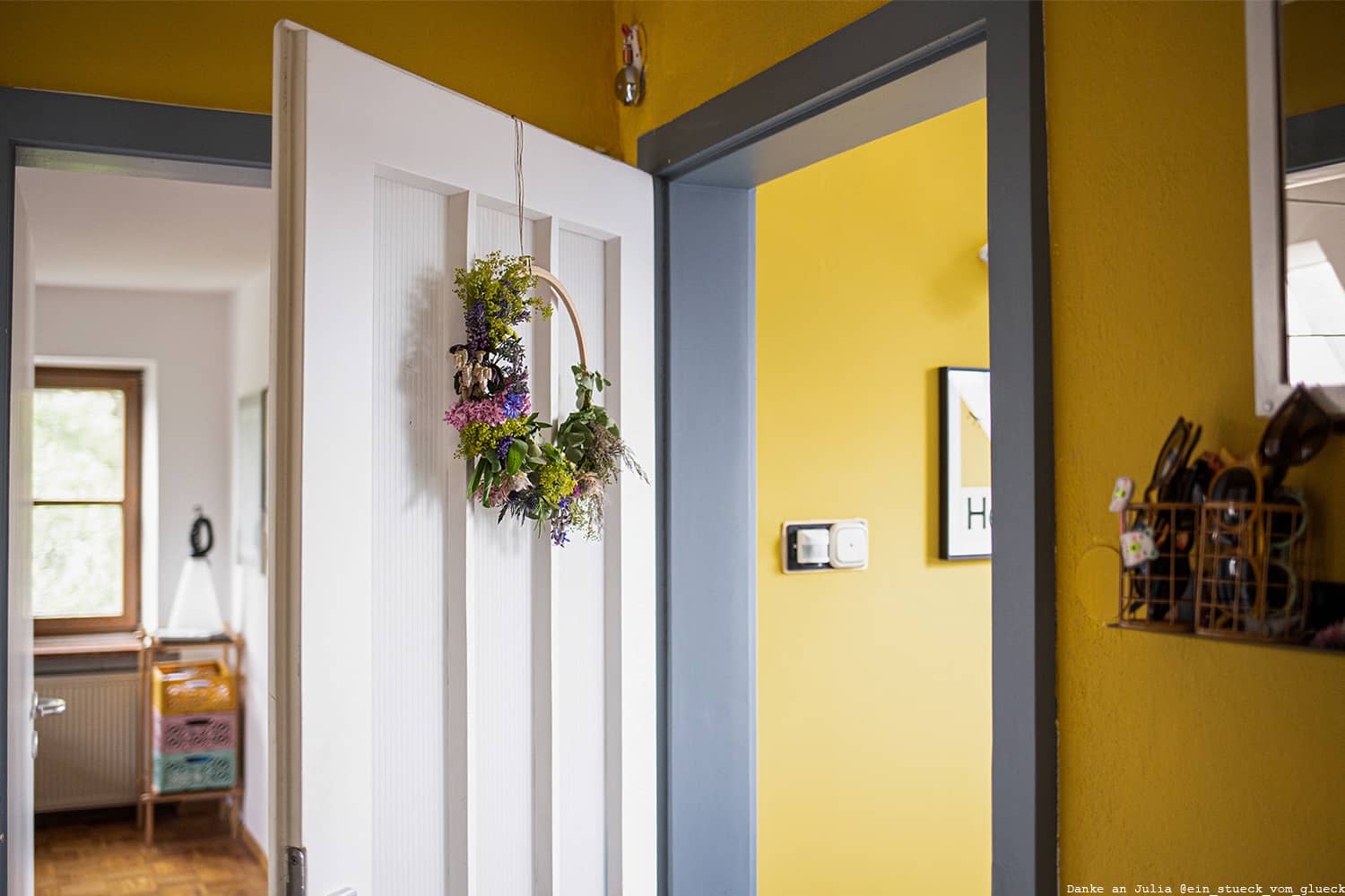 Julia ist selbständige Grafikdesignerin aus München mit einem Auge für schöne Dinge. Daher hat sie auch die Wandfarbe in Sonnengelb, die ihren Flur erstrahlen lässt, sorgfältig ausgewählt und auf den Raum und ihre Einrichtung abgestimmt. Wenn du genau hinschaust, entdeckst du hier und da auch bei den Wohnaccessoires gelbe Elemente, die harmonisch zur Wandfarbe passen. Die grau lackierten Türrahmen sind ein schöner Kontrast und die Elemente in Weiß, wie beispielsweise die Decke, die kleine Bank oder auch die Tür, bringen Ruhe in das gesamte Erscheinungsbild.