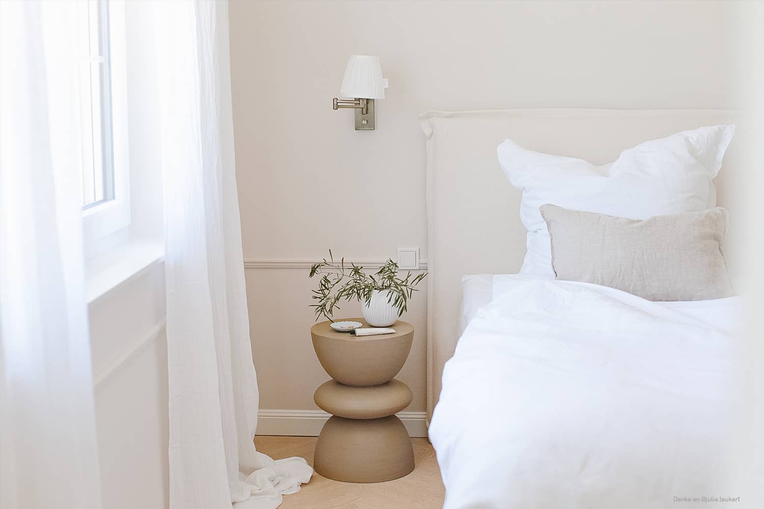Ein tolles Detail ist der Nachttisch in einem erdigen Braun - Grün. Dieser harmoniert optimal mit den hellen und sanften Tönen der Wände und der minimalistischen Einrichtung von Julia.