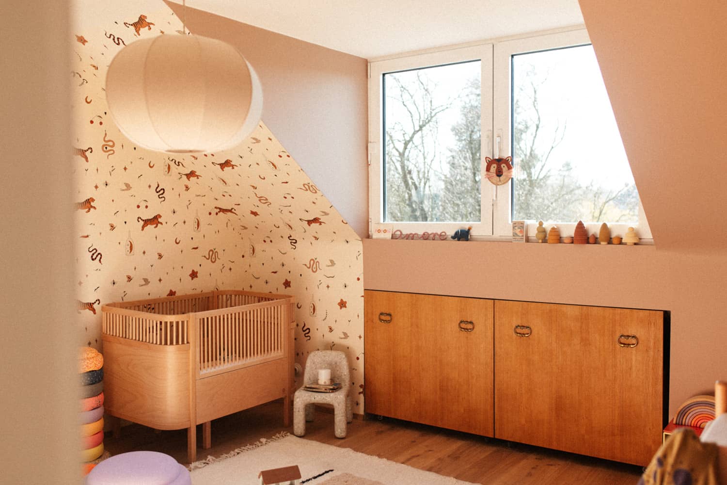 Der erdige Rosé-Apricot-Ton ist sanft und dennoch ausdrucksstark. Ob als Akzent an einzelnen Wänden oder großflächig im ganzen Raum – der Farbton bringt Ruhe, Wärme und Leichtigkeit ins Kinderzimmer.