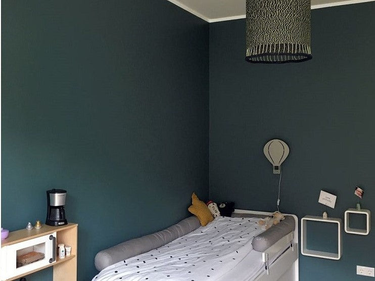 Diesen Farbton in Petrolblbau zusammen mit dem Natur-Weiß hat Stefanie zum Streichen der Wände in Mateas Zimmer verwendet.