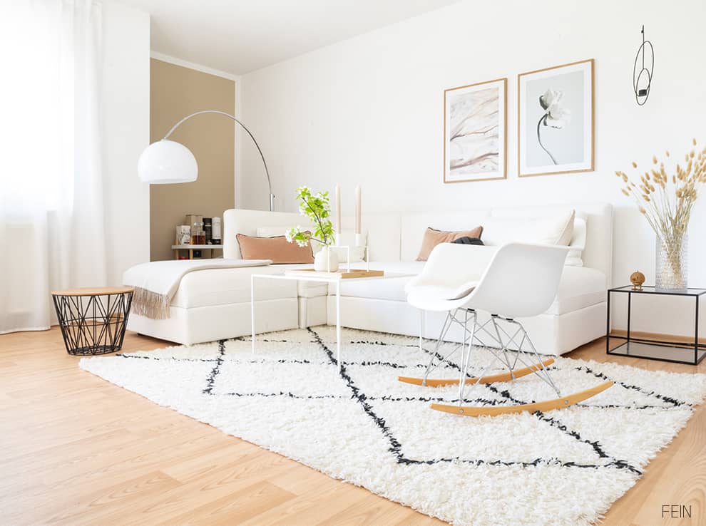 Zu dem hellen Holzboden passt die Wandfarbe genauso perfekt wie zu den weißen Möbeln und Holzelementen. Das weiße Sofa sowie die verschiedenen hellen und natürlichen Wohnaccessoires runden das Gesamtbild ab, sodass eine luftige und leichte Atmosphäre entsteht.
