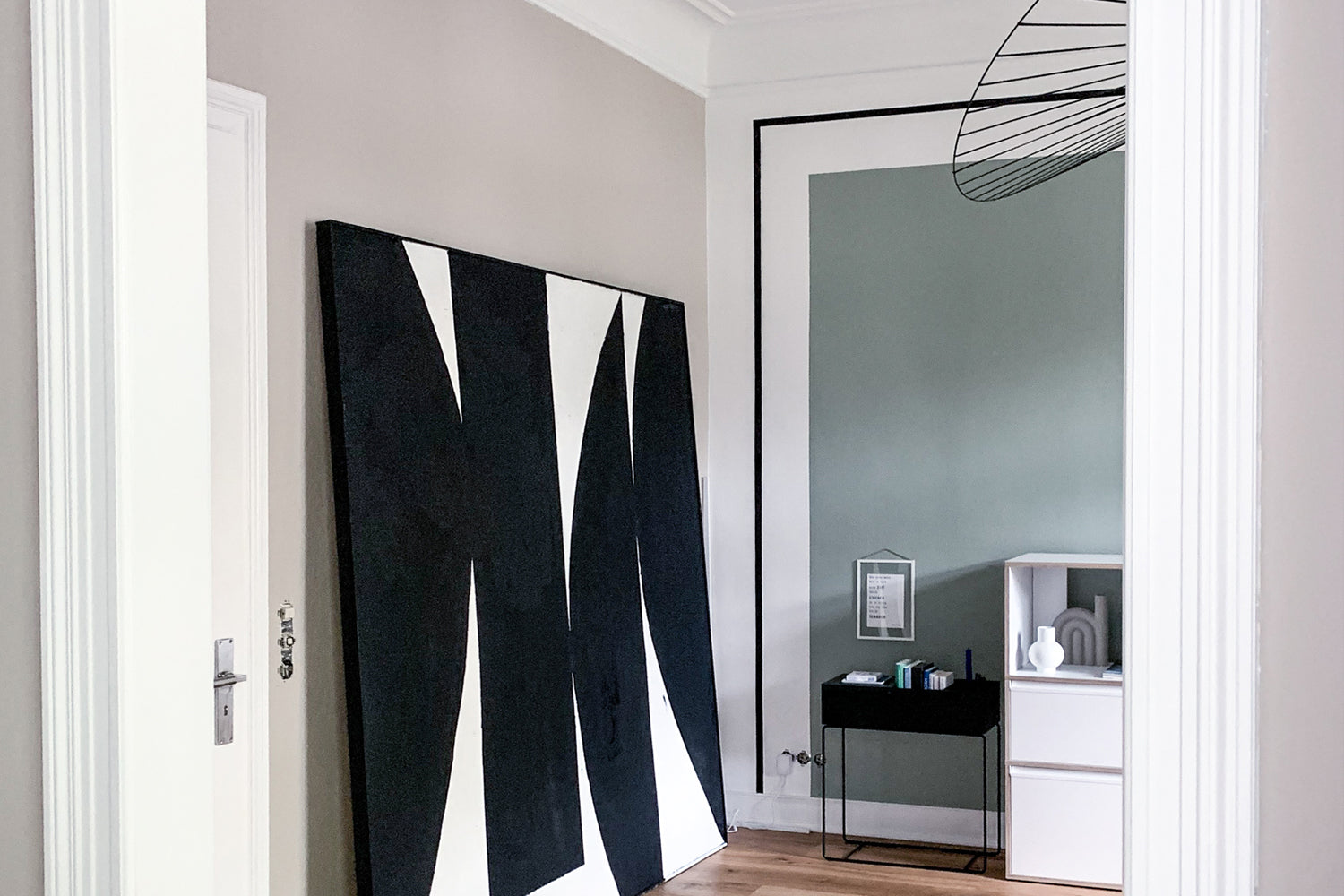 Besonders die große Leinwand in Schwarz-Weiß stellt einen tollen Kontrast dar und harmoniert super mit den Akzentwänden in Salbei und Greige. Auch die Akzentwand in Salbei mit einem tollen schwarzen Rahmen spiegelt sich in der Leinwand wieder. Ein tolles Farbspiel mit aufregenden Details.