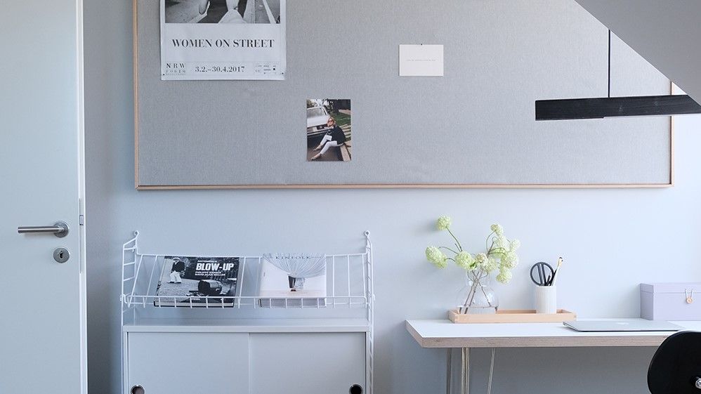 Bei der Arbeit im Home Office immer einen kühlen Kopf bewahren, dafür sorgt ein frisches Hellgrau an den Wänden im Arbeitszimmer. Den cleanen und minimalistischen Stil unterstreicht Sarah mit Möbeln und Wohnaccessoires in Weiß und anderen hellen Farben. Vereinzelte schwarze Farbakzente durchbrechen dezent die klare Linie.