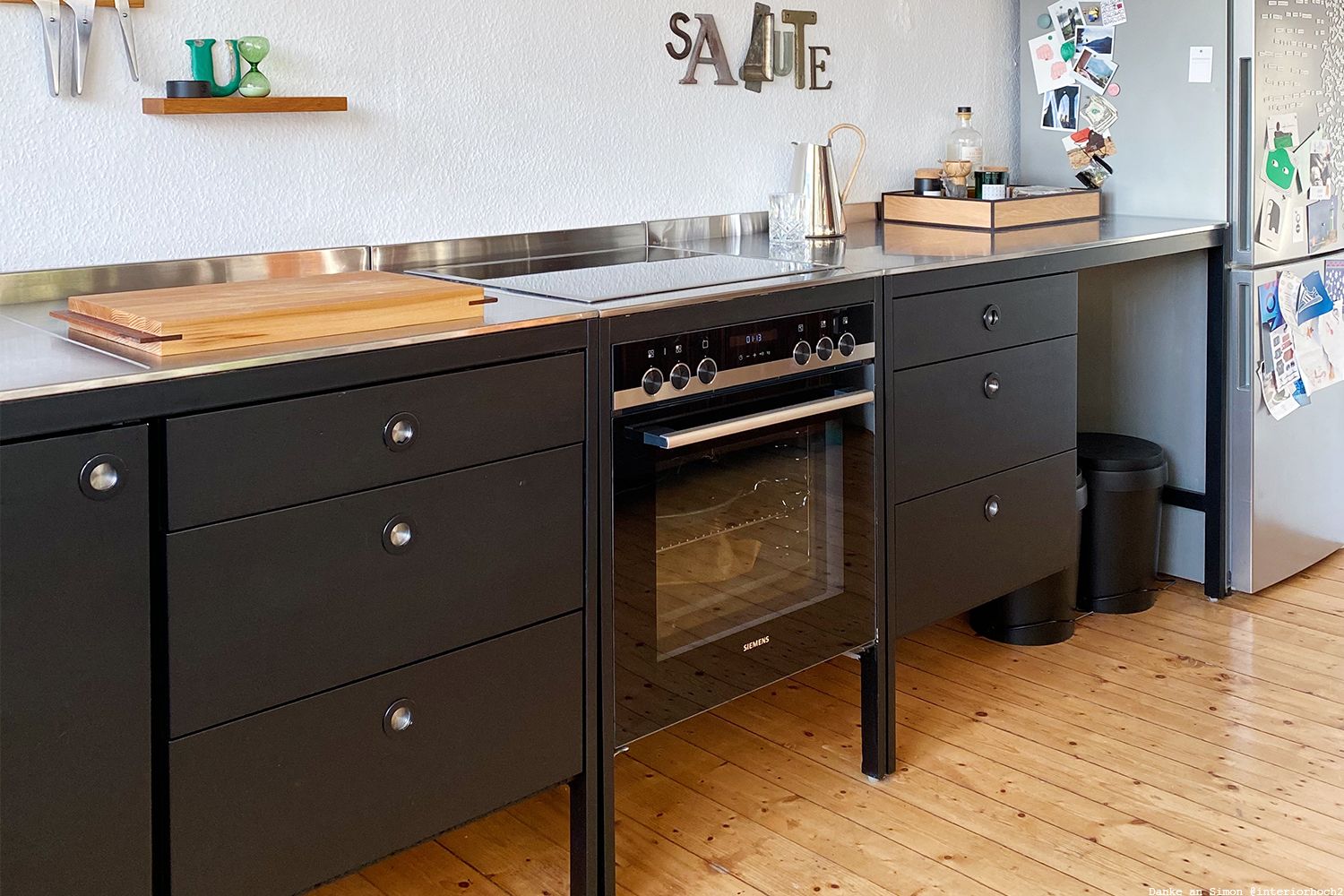 Warum nicht mal die Küchenfronten umlackieren? Upcyclen und optisch aufhübschen, was noch in gutem Zustand ist, ist schließlich super nachhaltig. Simón hat seine Küchenfronten in einem tiefdunklen Schwarz-Ton gestrichen. Schwarze Küchenfronten liegen im Trend und mit Möbellack ist der Anstrich schnell und einfach selbst gemacht.