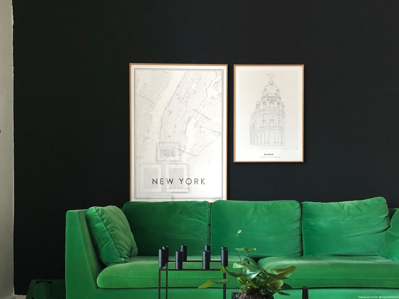 Simón kombiniert seine schwarze Wand zu ansonsten weißen Wänden. So kommt die Akzentwand noch besser zur Geltung. Ein weiterer Hingucker ist das kräftig grüne Sofa. Beides zusammen verleiht dem Raum eine spannende Atmosphäre und der warme Holzfußboden bringt wiederum die nötige Ruhe in das Gesamtbild.