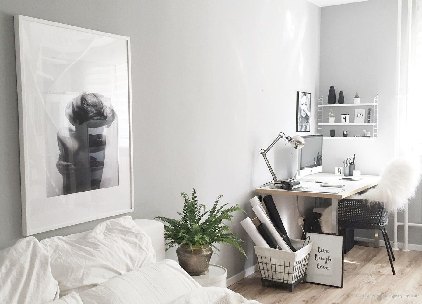 Im Schlafzimmer und im Arbeitsbereich hat Melike alle ihre Wände in einem hellen Grau gestaltet. Die helle Farbe wirkt dezent und edel und sorgt für ein stimmiges Gesamtbild. Gestrichen hat sie diesen Farbton in Hochdeckend.