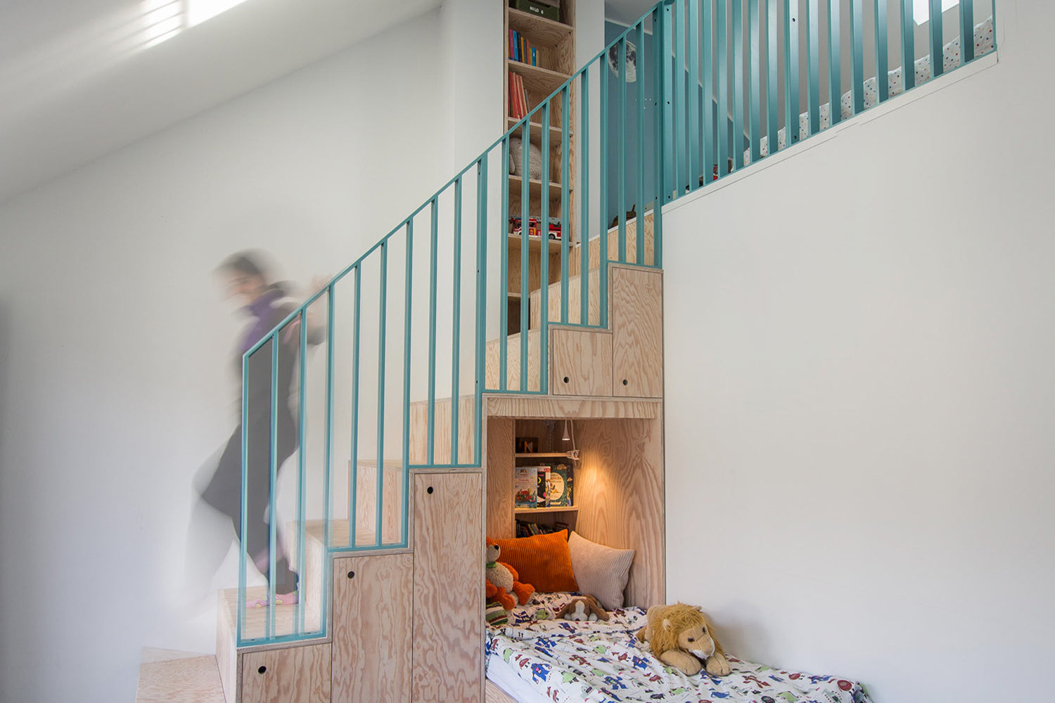 Bei diesem Projekt von Sima wurde das Kinderzimmer räumlich aufgeteilt, sodass die beiden Kinder jeweils ihren eigenen Bereich haben. Durch die geschickte Stauraumlösung im Treppenbereich wirkt der Raum klar und aufgeärumt.