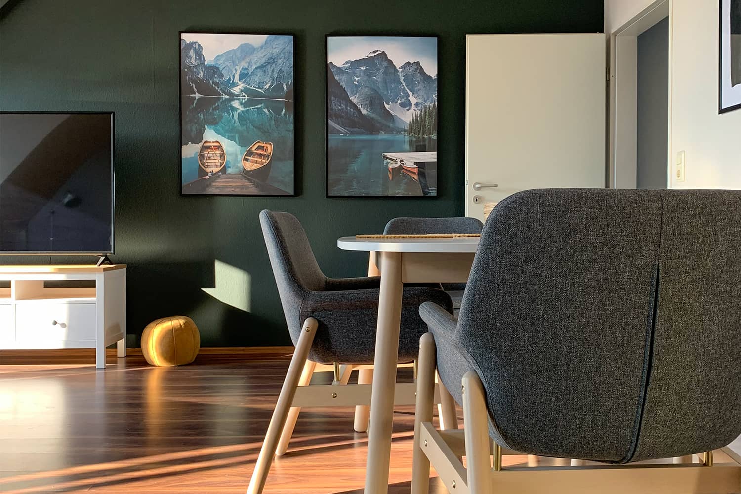 Bianca hat in ihrem Wohn- und Esszimmer eine Wand in einem kräftigen Dunkelgrün gestrichen. Zusammen mit den verschiedenen Holzmöbeln sowie dem Holzboden entsteht ein warmes, wohliges Raumgefühl. Bianca hat dafür diesen Grünton in Hochdeckend gewählt: