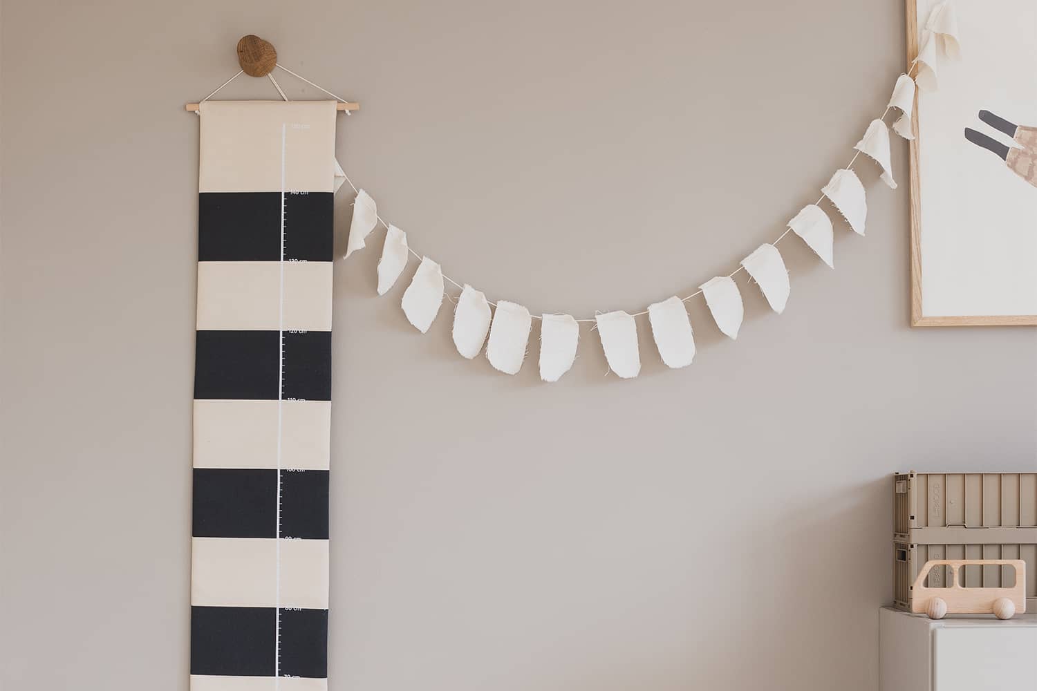 Sarah hat sich bei der Wandgestaltung des Kinderzimmers für eine zeitlose und zugleich moderne Wandfarbe entschieden: Greige. Die feine Mischung aus Grau und Beige wirkt schlicht und bringt zugleich Wärme in den Raum. Sarah hat außerdem den beistehenden Ikea-Ivar-Schrank in dem gleichen Farbton lackiert. So entsteht ein harmonisches Ton-in-Ton Konzept, welches das Zimmer aufgeräumt wirken lässt.