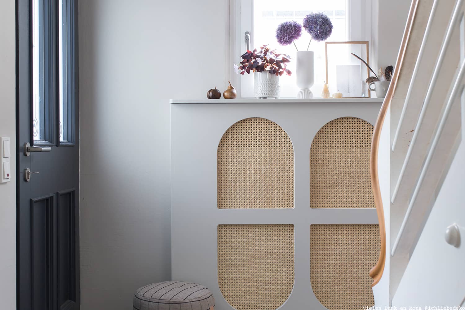 Mona hat für den Flur eine Heizungsverkleidung selbst gebaut. Um dieser noch den letzten schönen Schliff zu geben, hat sie diese Ton-in-Ton in dem feinen Beige-Grau lackiert.