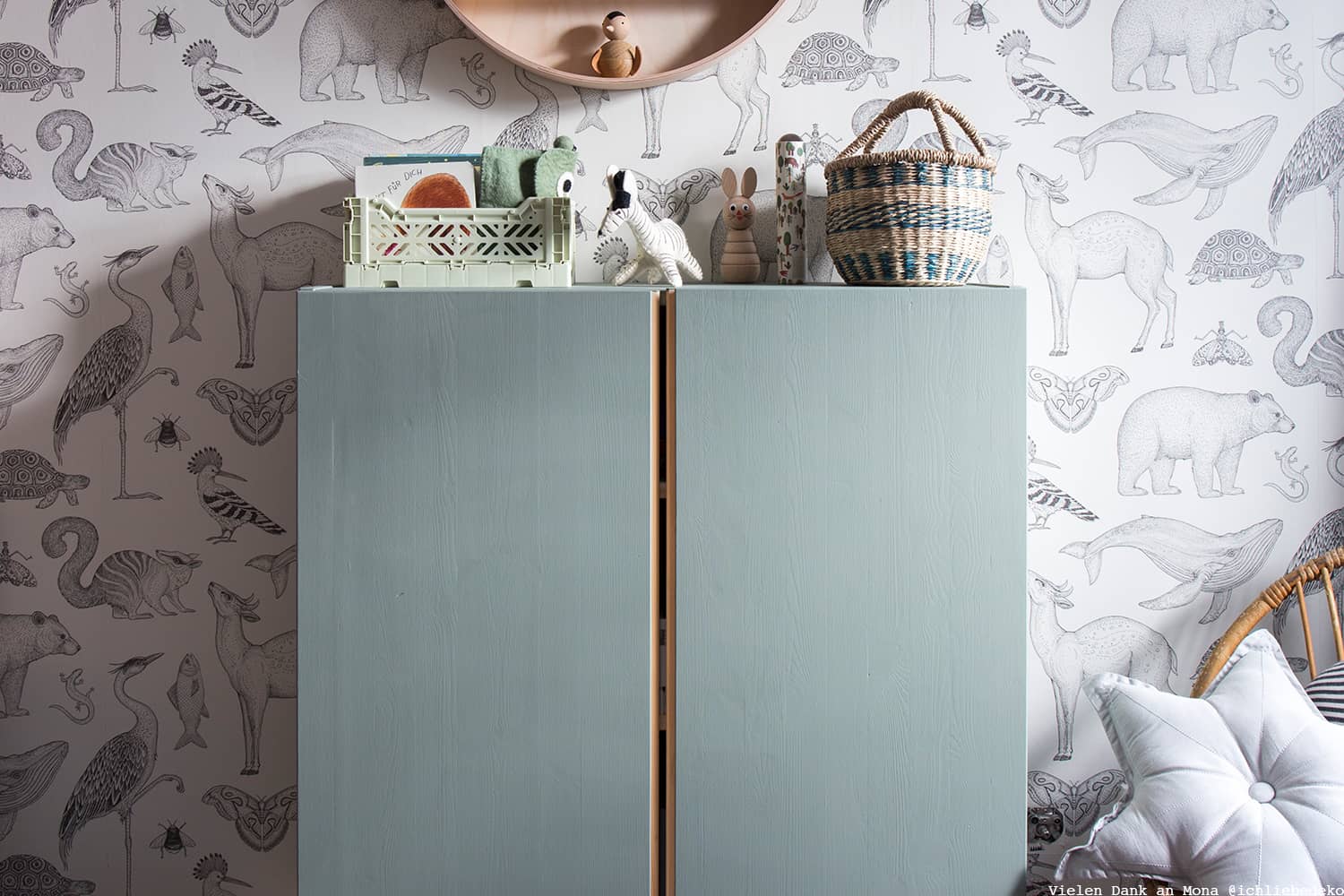 Für den Anstrich dieses Schränkchens im Kinderzimmer wurde zum Beispiel ein feiner Salbei-Ton gewählt, der harmonisch zur Einrichtung und Wandfarbe des Raumes passt.