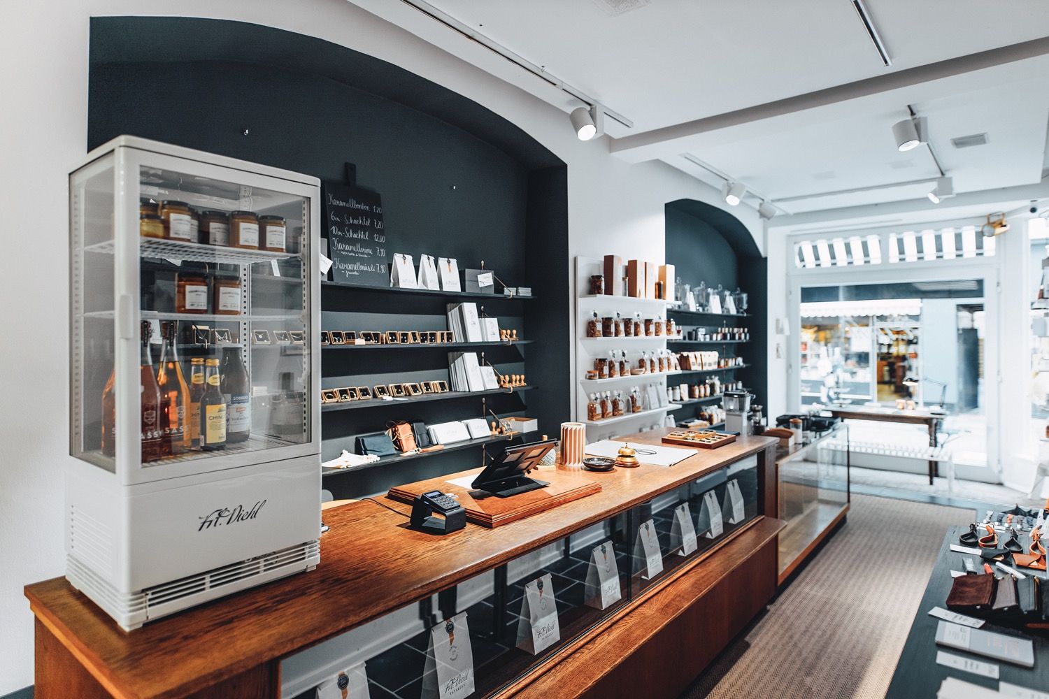 Der kleine, charmante Laden in der Koblenzer Altstadt hat außerdem besonders schönes Interieur... ist aber auch hat einen schönen Interieur einen Besuch wert. Und bei einer tollen Ladeneinrichtung braucht es natürlich die passende Wandgestaltung. Als Grundton wurde ein helles, zugleich warmes Grau-Braun an allen Wänden gestrichen. Mit einem satten Dunkelgrün als Wandfarbe werden die Nischen hinter der Verkaufstheke hervorgehoben und farblich abgesetzt. So entsteht ein rundum harmonisches Gesamtbild.