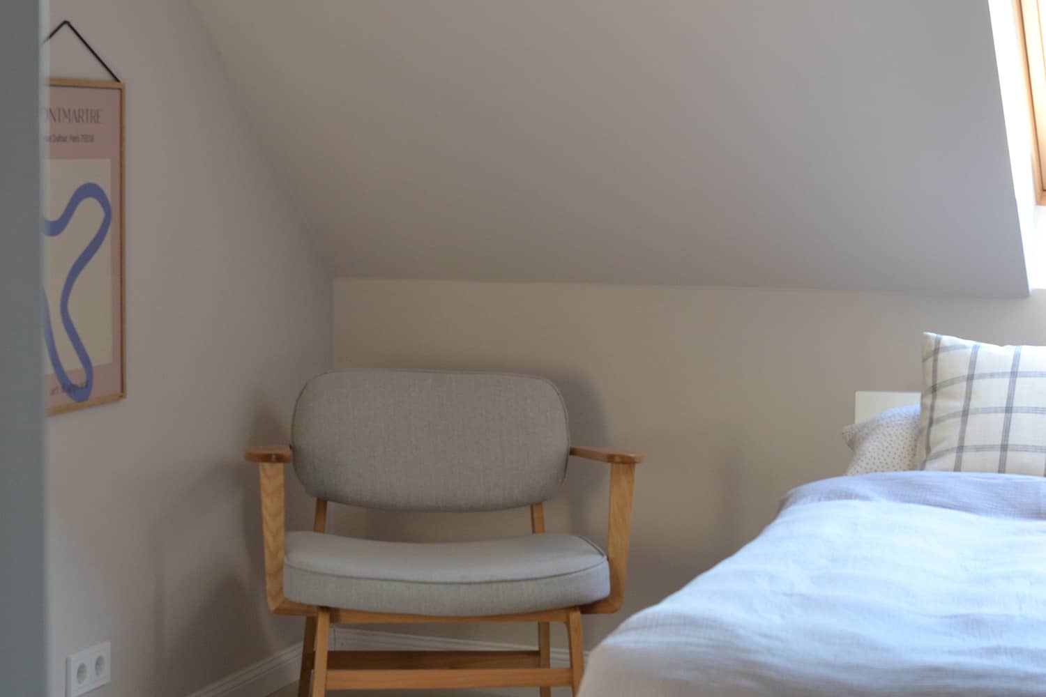 Der Raum liegt im Obergeschoss und hat eine große Dachschräge. Diese hat sie ebenfalls in der feinen Wandfarbe gestrichen. So wird der Raum optisch gefasst und die Übergänge wirken weich.