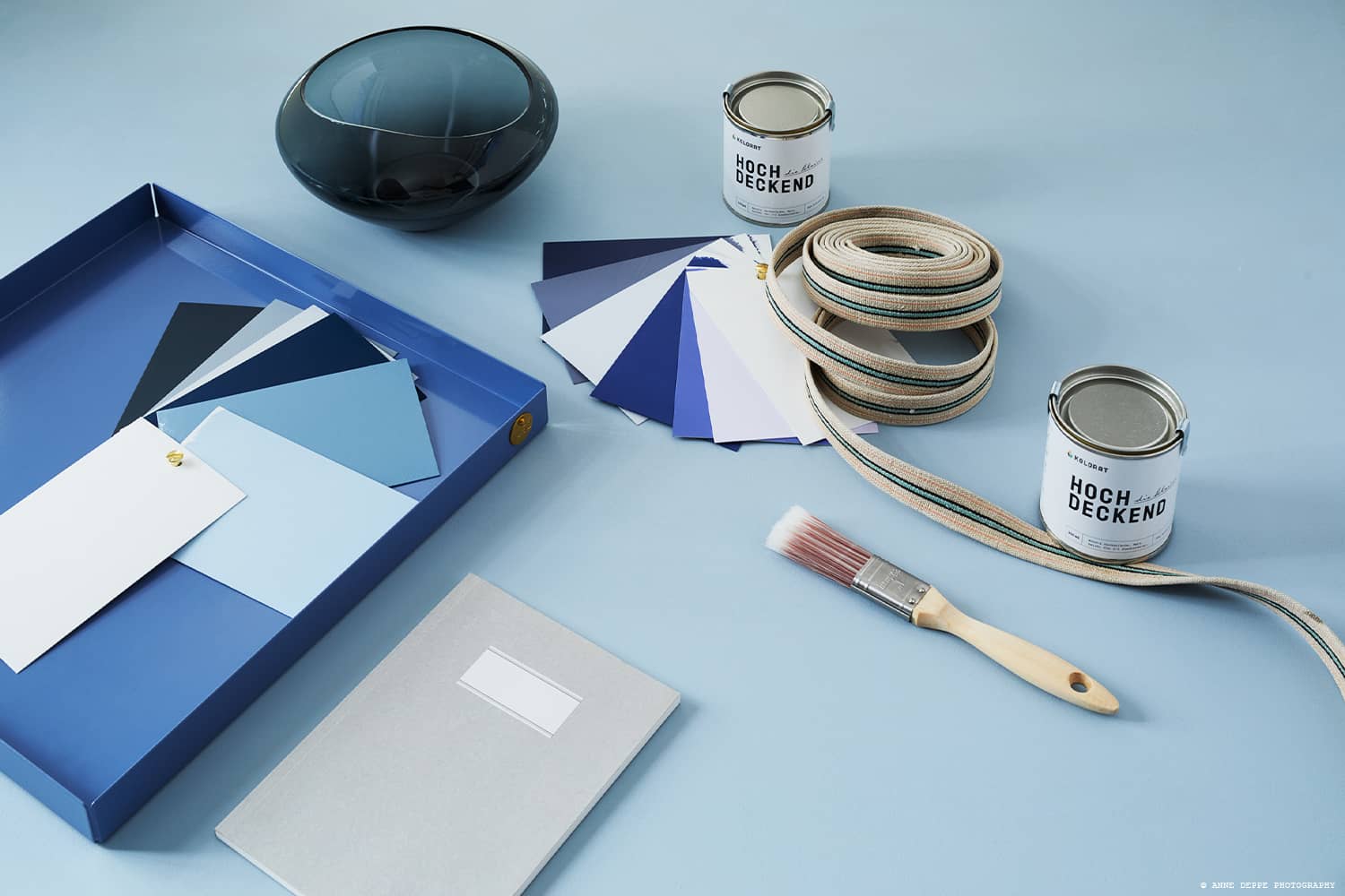 Warme Blautöne passen perfekt in überwiegend hell eingerichtete Räume oder zu grauen Wänden. Das Grau bringt die Blautöne zum Strahlen und im Gegenzug lassen die Blautöne das Grau gemütlicher wirken. Eine Auswahl an Wandfarben in Grau findest du hier: