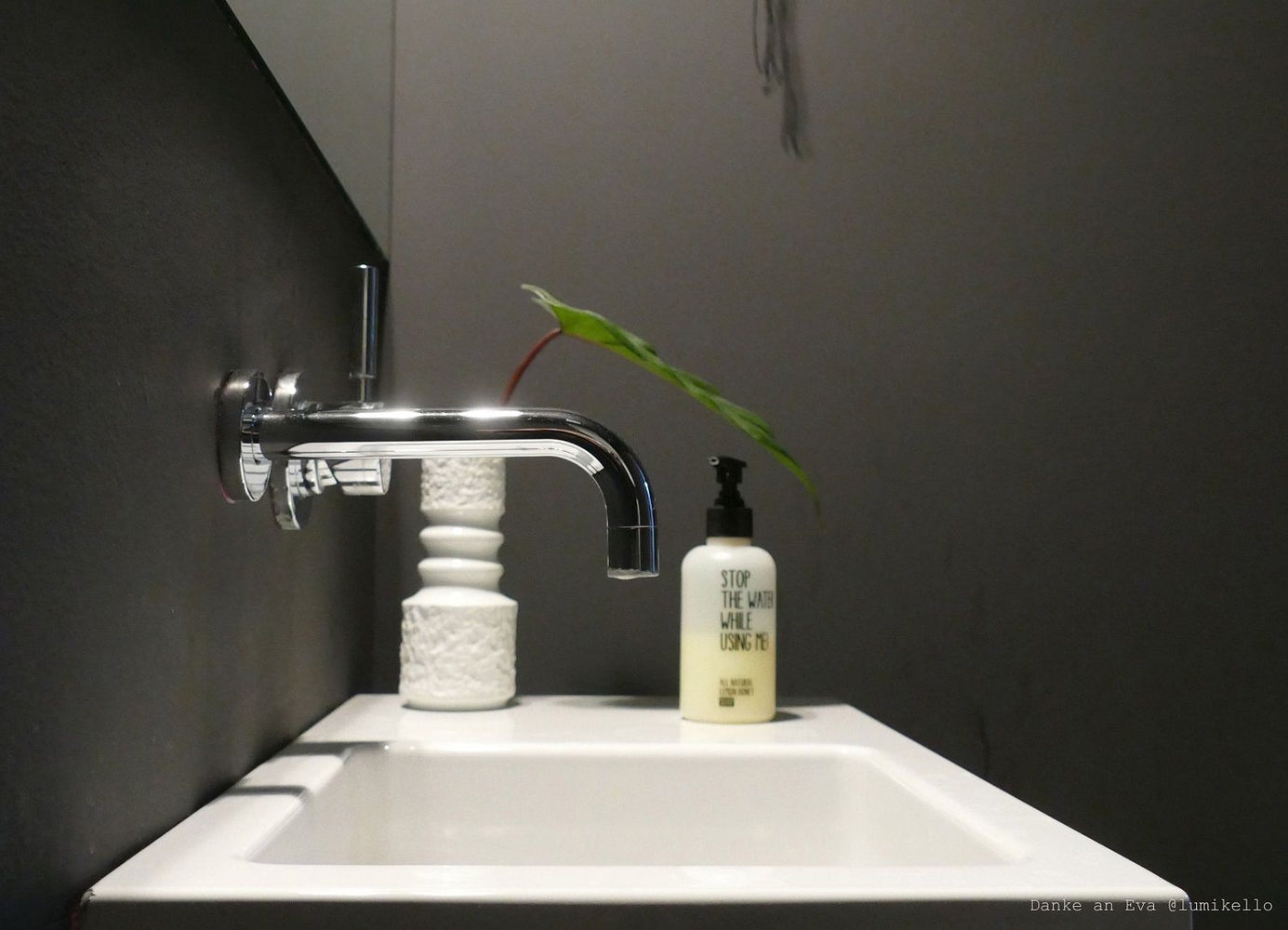 Warum nicht mal kleinen Räumen einen satten Anstrich verpassen? Mini-Räume sind ebenfalls für dunkle Farben geeignet. Eva hat das gesamte Gäste-WC in Schwarz gestrichen. Genauer gesagt alle Wände inklusive der Decke sind in dem dunklen Farbton gestrichen. Der Raum wirkt weder kleiner noch erdrückend, sondern bekommt eine tolle Atmosphäre und das Gäste-WC wird zu einem spannenden Ort.