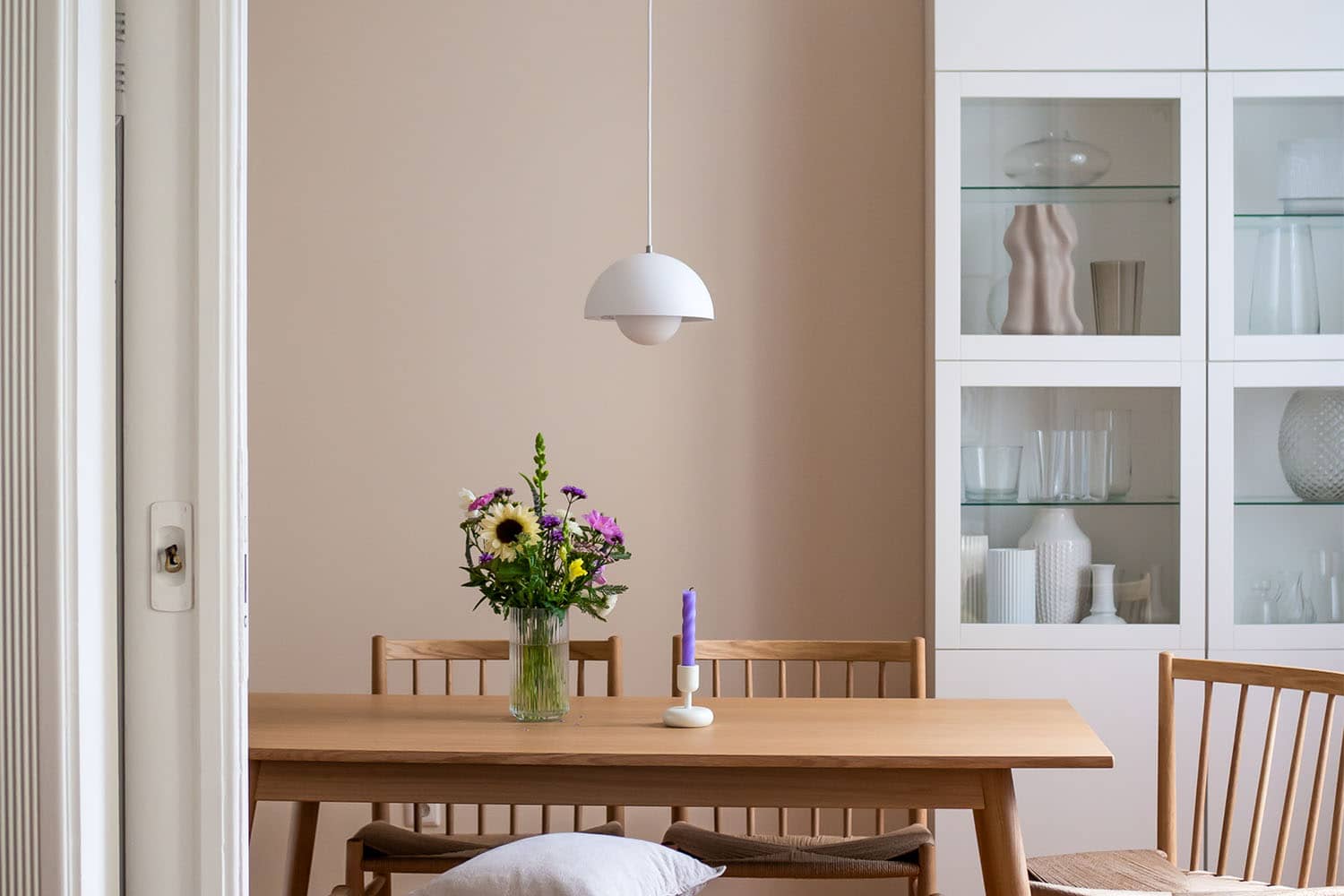 Der feine Sandton in Lenas Esszimmer harmoniert hervorragend mit dem Fußboden aus Holz und bringt eine warme Atmosphäre in den Raum. Mit den hellen Möbeln und schlichten Wohnaccessoires wirkt der Raum behaglich und zurückhaltend elegant zugleich.