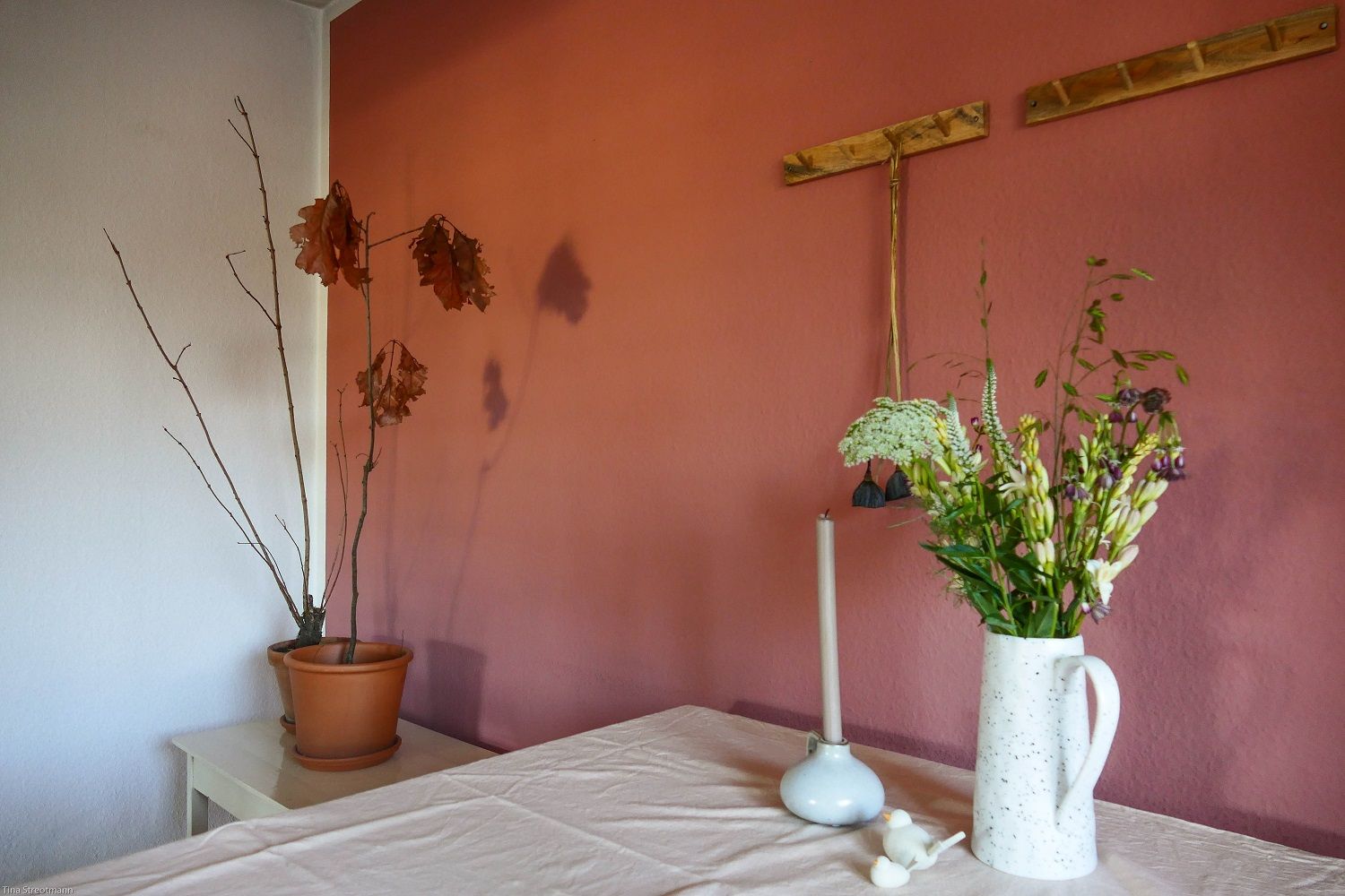 Bordeaux und Weinrot sind als Wandfarben sehr anpassungsfähig und flexibel. Tina hat eine Wand in ihrem Esszimmer in einem Weinrot gestrichen und kombiniert dazu viel Weiß, Möbel aus Holz und verschiedene Pflanzen. So wird der erdige Charakter der Wandfarbe betont und ein Bezug zu Natur hergestellt, was das Raumbild insgesamt sehr natürlich und belebend wirken lässt.