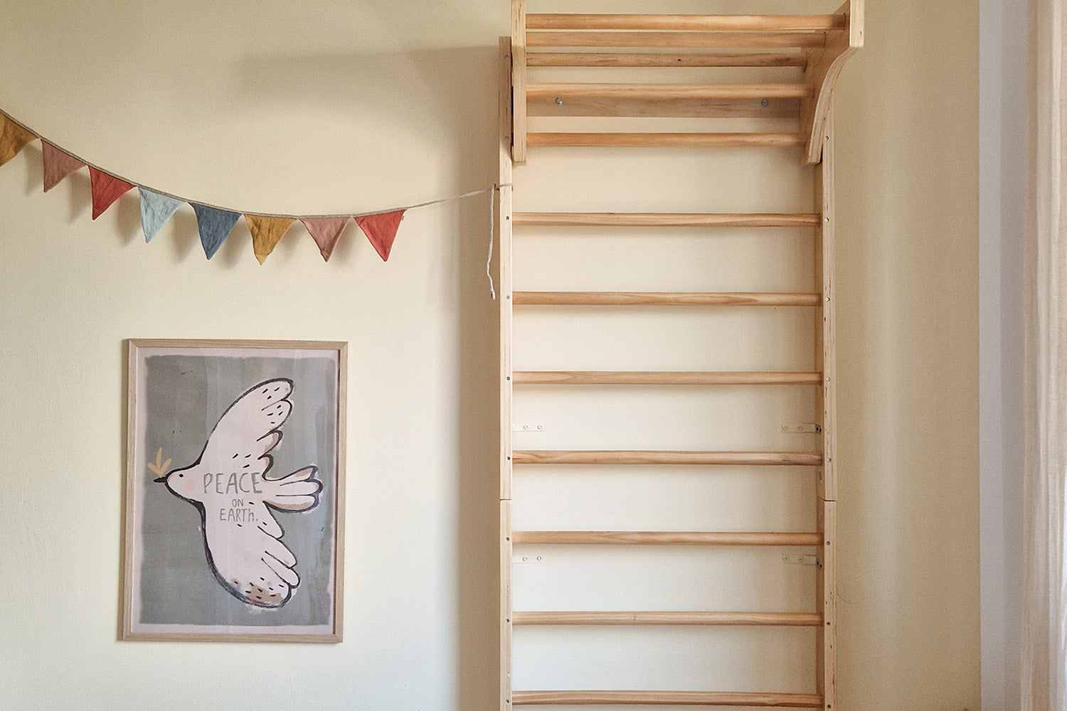 Anna hat ihr Kinderzimmer farblich gestaltet und die Wand halbhoch in einem Currygelb gestrichen. Der Dielenboden und die hellen Holzmöbel harmonieren wunderbar mit der Wandfarbe und es entsteht ein stimmiges Raumbild.