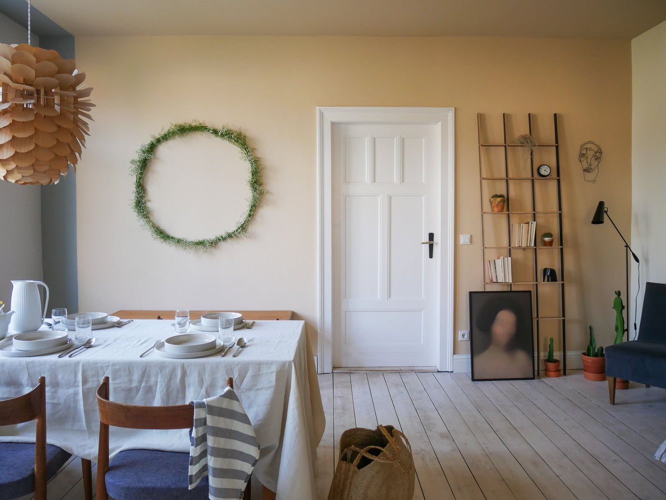 Lea hat ihr Esszimmer in einem feinen und hellen Beige als Wandfarbe gestrichen. Der Farbton ist mit einem Hauch Grau versetzt und passt perfekt zu den Möbeln und dem Boden aus hellem Holz - ein gemütlicher, skandinavisch angehauchter Einrichtungsstil.