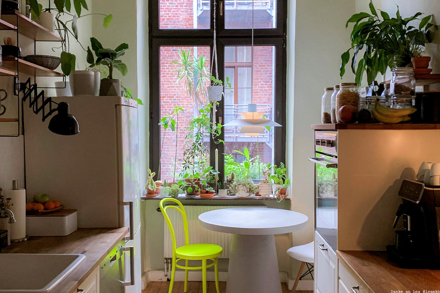 Lea hat für ihre Küche ein feines Gelbgrün gewählt. Der Farbton ist eine Mischung aus Grün und Beige mit einem Hauch Gelb versetzt. In dem Farbton hat sie alle Wände im Raum gestrichen. Die Farbe ist sanft und dezent, hält sich im Hintergrund und bringt eine sanfte Farbigkeit in den Raum. Gemeinsam mit den zahlreichen Pflanzen und der gelbgrünen Wandfarbe wird die Küche zu einem angenehmen Wohlfühlort.