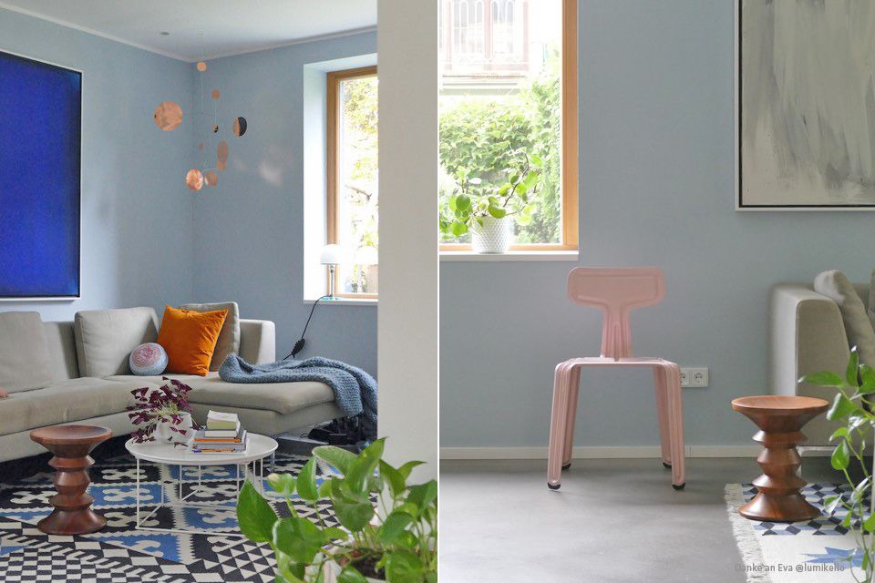 Ein ruhiger, sanfter Mix aus Hellblau mit Grau und hellem Holz findet sich in Evas Wohnzimmer.