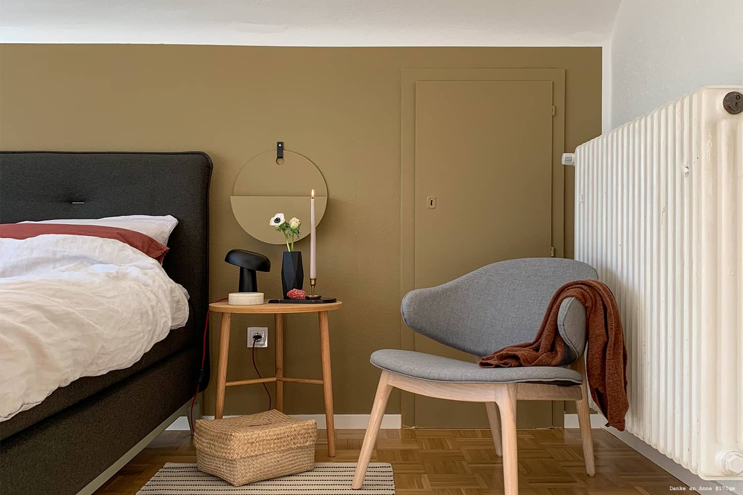 Anne kombiniert ein edles Ocker an einer Akzentwand im Schlafzimmer mit einem feinen Greige an den übrigen Wänden. Eine wunderbar harmonische und gemütliche Farbkombination in Annes Schlafzimmer. Der warme Braunton kommt als Akzentfarbe an der Bettseite schön zur Geltung. Dazu passend kombiniert Anne verschiedene Holzmöbel und Accessoires aus natürlichen Materialien.