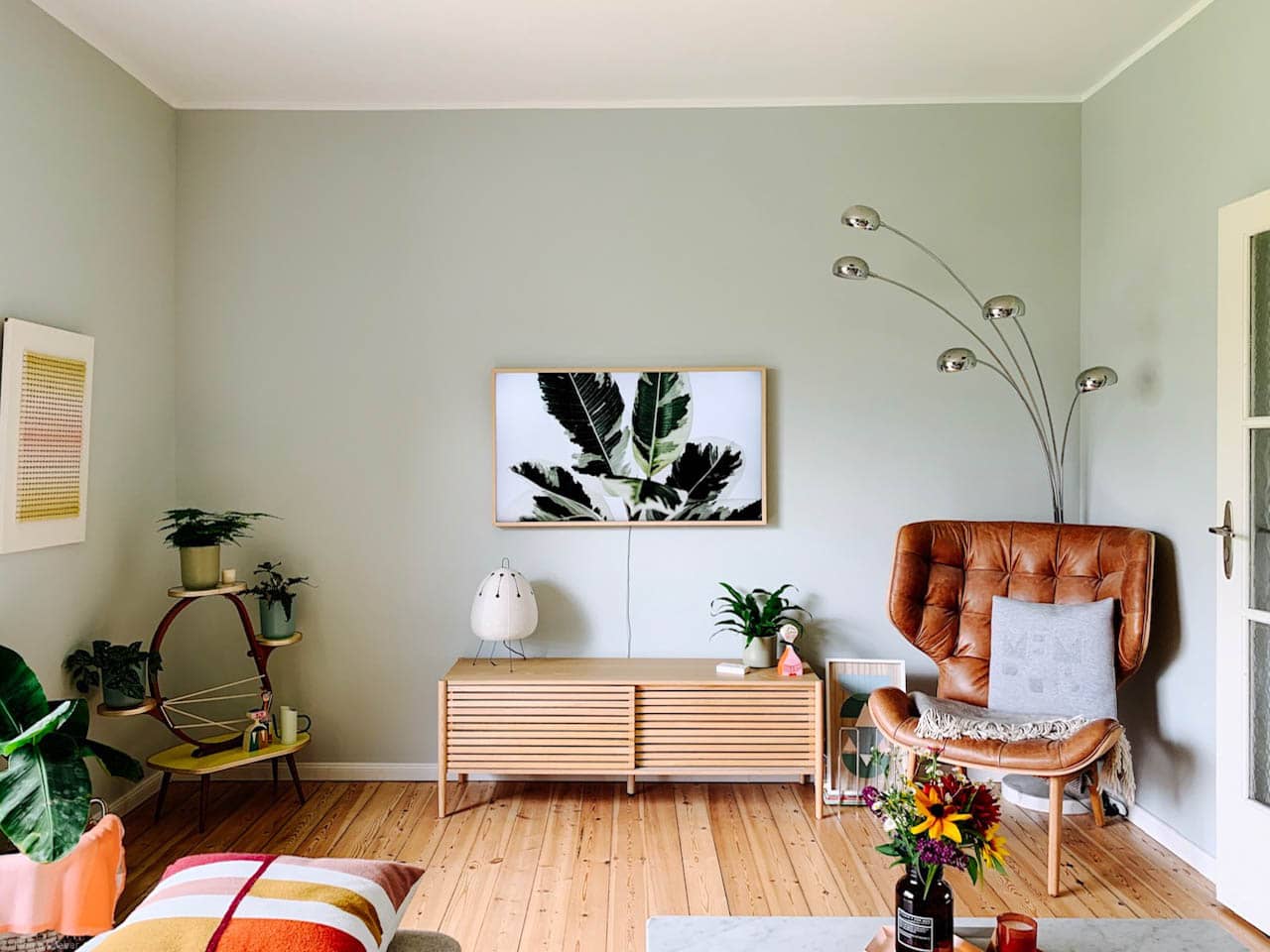 In Kombination mit natürlichen Materialien zu Pastellgrün gestrichenen Wänden entsteht ein wohlig stimmiges Gesamtbild in Sarahs Wohnzimmer. Holz und Grün-Töne wirken als Material und Farbe der Natur beruhigend und ausgewogen.