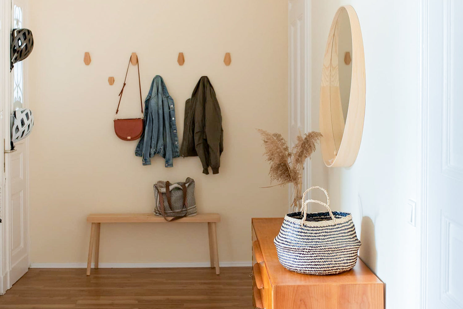 Zartes, vanilliges Pastellgelb macht den Flur oder Eingangsbereich herrlich hell und einladend. Francis kombiniert ihn zu Boden und Möbeln aus verschiedenen, warmen Hölzern sowie Wohnaccessoires aus Naturmaterialien.
