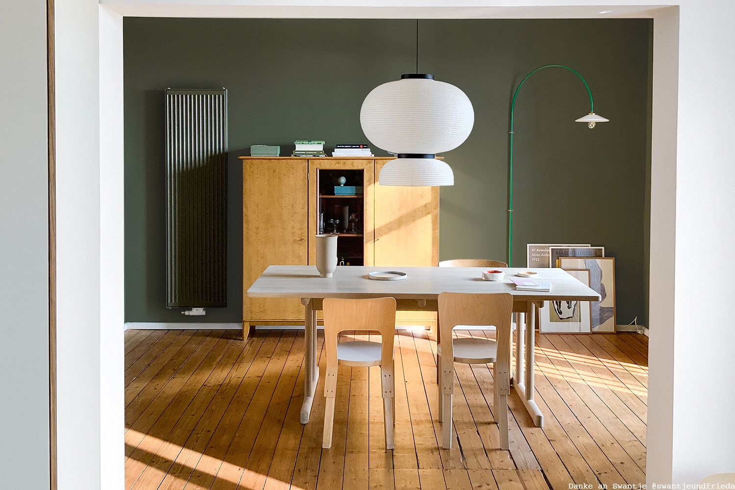 Swantje hat einen beruhigenden Farbton in dunklem Waldgrün für ihr Esszimmer gewählt. Und, harmoniert er nicht bestens mit den Möbeln aus Holz und dem warmen Holzfußboden?