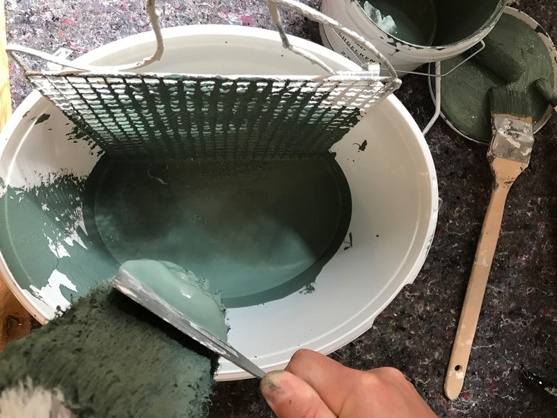 Zunächst solltest du die Farbwalze am Eimerrand absetzen und mit einer Spachtel die Farbe herausstreifen, sodass möglichst wenig Farbe noch in der Walze ist, wenn du mit dem Auswaschen beginnst.