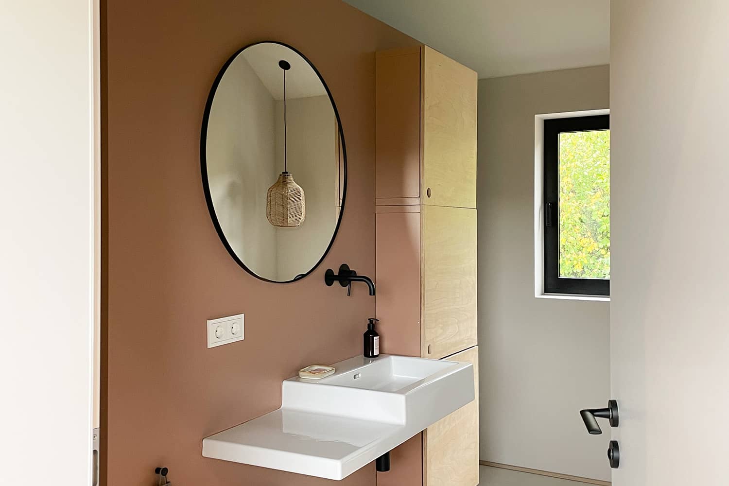 Für die BESTA-Schränke im Badezimmer wurde dieser schöne Farbton als matter Lack aus der Kolorat Farbpalette genutzt und Ton-in-Ton mit der Wand gestrichen.