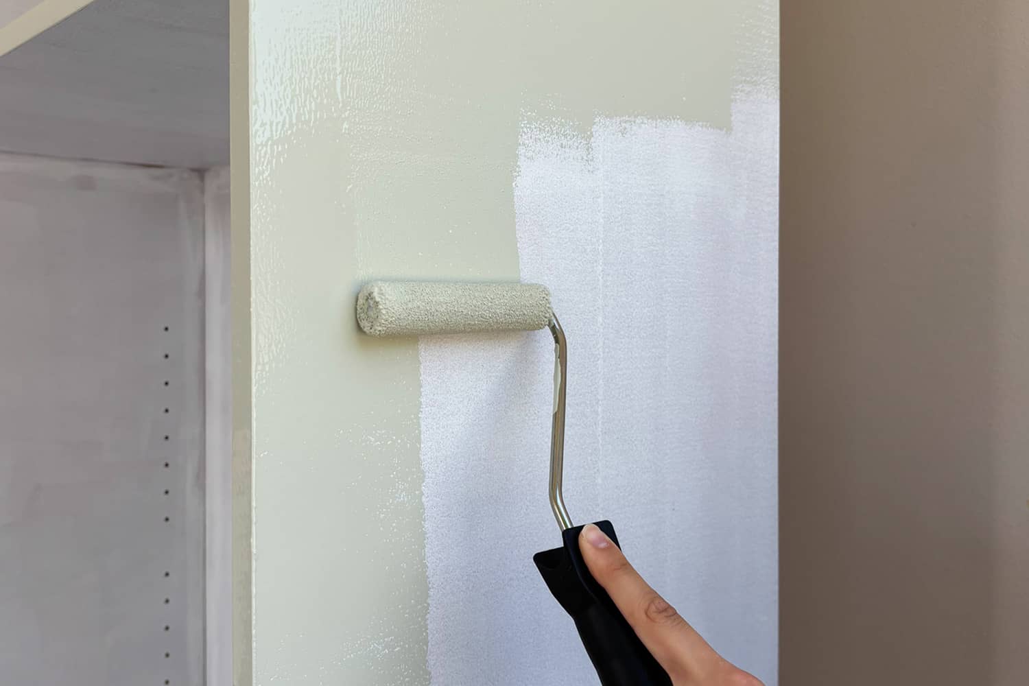 Falls du doch einmal zu viel Farbe aufgetragen hast und sich Farbnasen gebildet haben, kannst du diese nach vollständiger Trocknung am besten bearbeiten. Lass die Farbe zunächst durchtrocknen und versuche nicht, während der Trocknung die Stelle auszubessern. Schneide nach der Trocknung die Laufnasen mit einem Cutter horizontal weg und schleife den Übergang bei. Entferne den Staub und lackiere die Flächen nochmal mit der Lackrolle++ oder dem Lackpinsel nach.