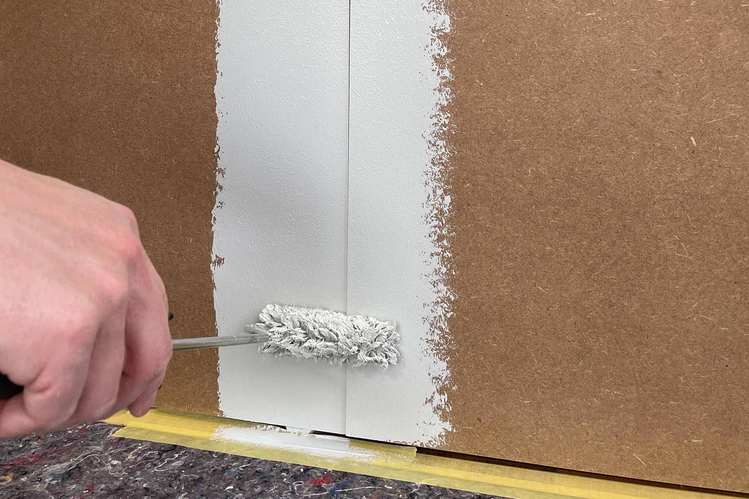 Trage die Grundierung an den Rändern bzw. in den Rillen mit einem Lackpinsel auf und verwende auf der Fläche die Lackrolle++. Lass den Anstrich richtig durchtrocknen. Den Pinsel anschließend einfach mit Wasser auswaschen und du kannst ihn für den nächsten Anstrich wiederverwenden. Ist keine Grundierung notwendig, beginne direkt mit dem Lackieren.