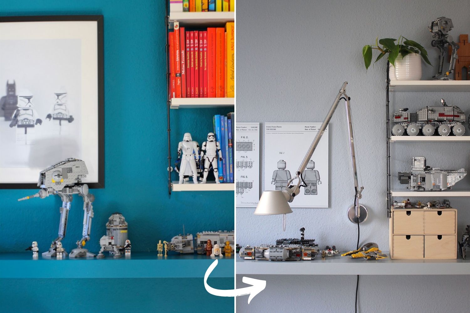 Dieses Kinderzimmer erstrahlte vorher in einem kräftigen Petrolblau. Dann wurden die Wände mit einem zarteren Grau-Blau mit der Wandfarbe Hochdeckend überstrichen und das ohne vorher die Wand nochmal Weiß zu streichen. Mit zwei Anstrichen war die vorhandene Farbe vollständig überdecke.